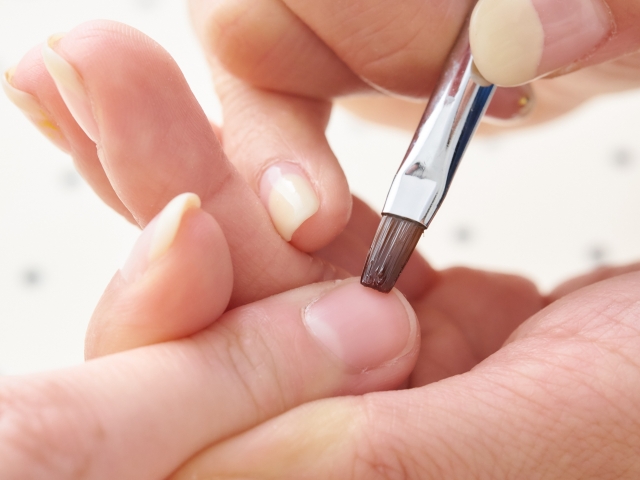 透明なジェルで爪をコーティングし、補強と保護を行います